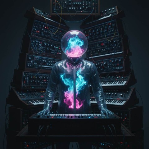 Surreal Keyboardist with Glass Sphere Head Filled with Glowing Neon Gas