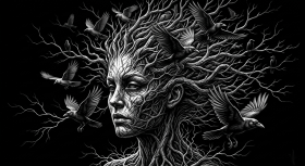 A haunting surreal illustration of a woman whose head transforms into intricate tree branches, with birds flying through her hair. Rendered in striking black and white, this artwork uses high contrast lighting to emphasize facial details and organic textures. The eerie atmosphere and mysterious composition create a sense of unease, blending nature and human form in a dark surrealistic style. Ideal for fans of conceptual art, gothic visuals, and expressive monochrome design.