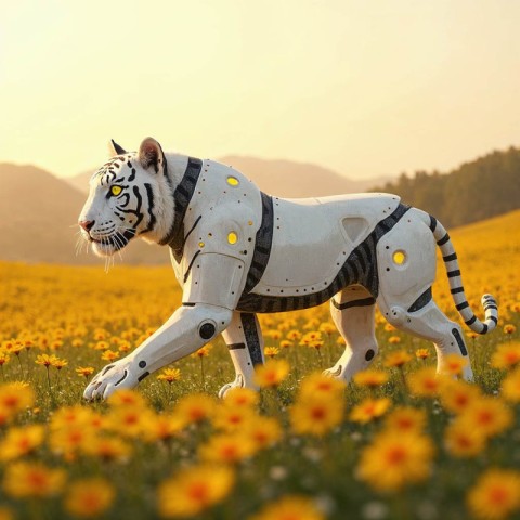metal hills 3d robot nature flower garden fantasy 3d animal animal ai images digital artwork vibrant sunset artwork tiger walking through field yellow flowers bright yellow flowers robot tiger tiger future robotic robotic tiger skySimilar Photos