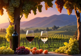 Vineyard on the table Wine Bottle Wine in the glasses AI Generated Image
