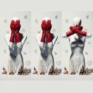 White Mannequin with Red Gloves Covering Its Eyes