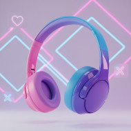 AI Prompt: 3D headphones simple design, glossy polished finish, vibrant gradient from pink to blue to purple, soft reflections, youthful and modern style, clean futuristic background inspired by Tinder UI, glowing neon edges, soft cinematic lighting, minimal UI elements, ultra-detailed, 4K render.