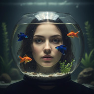 AI Prompt: A photo realistic image of a beautiful woman with a fishbowl around her head with 3 fish swimming around completely inside the fishbowl.