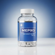AI Prompt: A bottle of medicine "MEPIKS" that is made of transparent PET plastic and has a label that is royal blue.