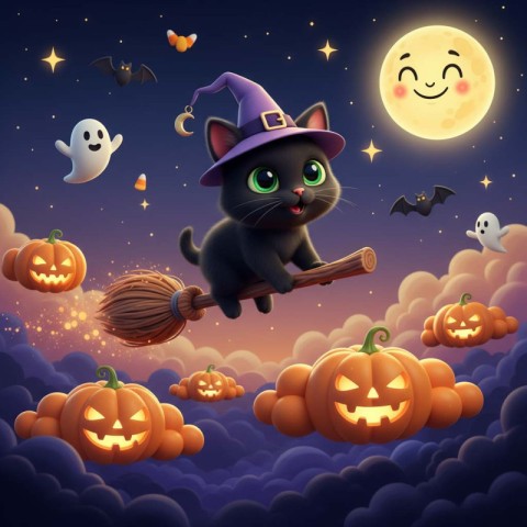 AI Prompt: An adorable black cat wearing a tiny witch hat sitting on a flying broomstick, soaring above jack-o'-lantern clouds, cartoon-style moon smiling in the background, fantasy Halloween world, 3D cartoon look.