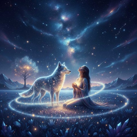 AI Prompt: surreal night field under stars, woman kneeling as a glowing spirit dog made of starlight circles around her, both glowing softly, representing eternal love beyond death, cinematic emotional surrealism.