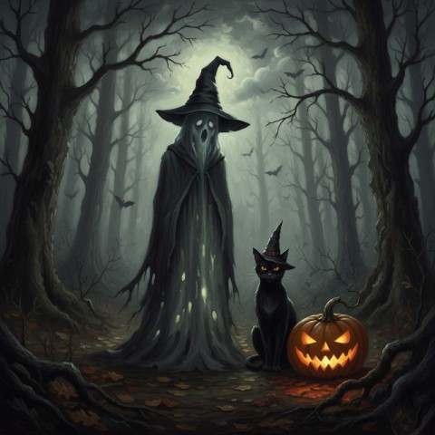 AI Prompt: A Halloween gothic painting of a ghost wearing a witch hat standing in a dark, misty forest. Beside the ghost is a black cat also wearing a pointed witch hat, sitting next to a carved glowing jack-o-lantern pumpkin. The atmosphere is eerie but whimsical, with bats flying in the background. The art style is realistic yet painterly, with textured brushstrokes, dark muted tones, and a slightly vintage aesthetic. Soft dramatic lighting, detailed shadows, and a haunting but cozy Halloween mood.