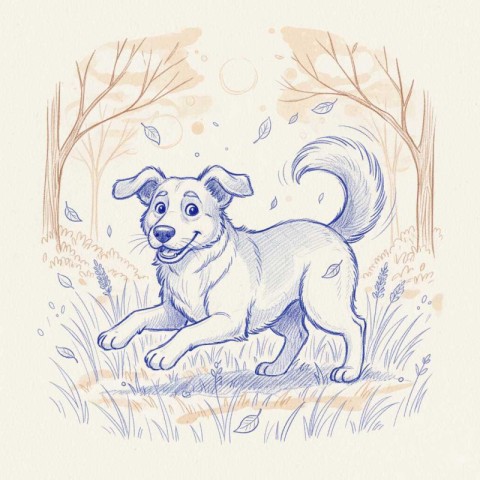 AI Prompt: a hand-drawn ink sketch of a dog coming to life, standing up, wagging its tail, then lying down playfully like a hunter ready to play, surrounded by autumn scenery with medium-height grass, trees, and gently falling leaves drawn in the same blue ballpoint pen sketch style on white paper, smooth camera, natural motion, soft pencil-like shading, warm autumn atmosphere style of hand-drawn line art animation, minimalistic background, subtle paper texture.
