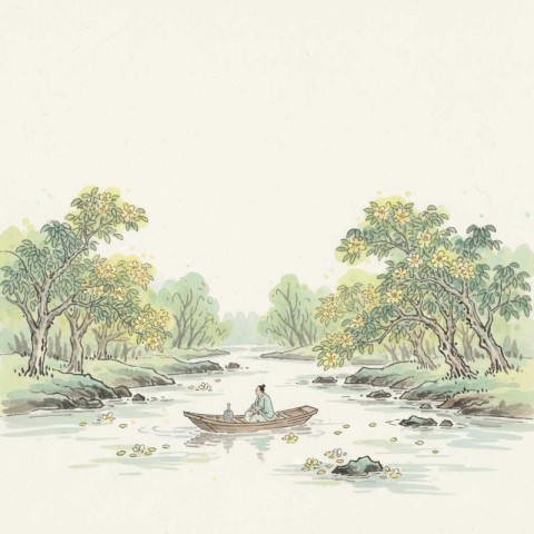 AI Prompt: On a white textured paper, in the style of Kaii Higashiyama,Ink wash harmony,freehand,simple style,A small human figure in traditional Han clothing stands on a small boat, with a jar of wine placed inside. The boat drifts along the river, where sweet-scented osmanthus flowers float on the surface. Osmanthus trees line both banks, The blank negative space creates the beauty of artistic conception, The pastel green and yellow tones in the artwork create a natural feel, with the figures seeming small and contemplative amidst the dynamic movement of the painted lines, creating a magnificent and spectacular landscape,epic scene,artistic conception, interlaced and superimposed, artistic aesthetics, high resolution.