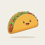 AI Prompt: "A smiling taco with its body slightly floating off the ground and tilted with 3/4 angle to the right. Flat illustration, no legs or feet."