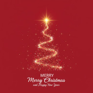 AI Prompt: Abstract modern Christmas poster, minimalist style, featuring a dreamy particle-composed abstract Christmas tree fading into a bright star shape at the top, surrounded by scattered tiny golden stars. The background is solid red, clean and bold. Text: "MERRY Christmas and Happy New Year" in white artistic font at the bottom. Style: flat, contemporary, with strong color contrast. Overall: a festive and design-forward Christmas-themed poster with abstract particle artistry. aspect ratio: 1:1