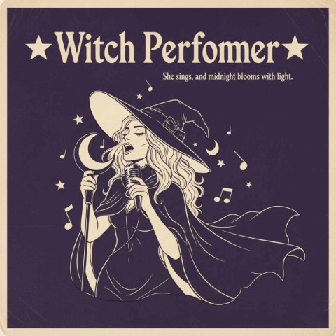 AI Prompt: Antique Musical Jacket poster, black bold vector outlines, minimal shading, plain dark violet background, vivid color photo realistic, aged matte record sleeve texture, witch idol with long wavy hair, starlight eyes and a flowing cape, singing into a crescent-moon mic, hat rim glowing softly, floating music notes shaped like stars, title text: "?Witch Performer?", caption: "She sings, and midnight blooms with light.", subtle elegant sign "Ozmo Aiart" in corner.