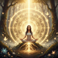 AI Prompt: n asian woman in meditation pose with a tender Mona Lisa smile, tiny figure in the frame, full body visible, wide environmental shot, camera pulled back far, centered in the scene. All around her, a huge circular golden shield of sacred geometry radiates, fully surrounding her aura and energy field, extending beyond her head and legs, luminous and translucent like liquid sunlight. A column of golden light descends from the heavens into her crown, while glowing roots of light flow deep into Mother Earth. She sits in a forest clearing, bright and magical, illuminated by golden light, soft mist, enchanted glowing plants, butterflies and fireflies, ancient trees glowing faintly. The overall atmosphere is radiant, luminous, breathtaking, divine not dark, but filled with shimmering golden-white brilliance, cinematic wide shot, ultra-detailed, ethereal fantasy spiritual artwork.