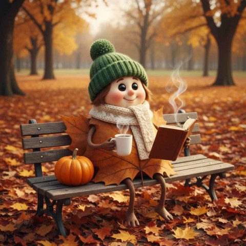 AI Prompt: A cute, autumnal character in the form of a large, brown-orange maple leaf with arms and legs. She has a friendly, round face with large black button eyes and a smiling mouth. She wears a knitted green woolen hat with a pompom on her head and a thick scarf around her neck. In one hand she holds a steaming cup of hot cocoa or coffee, in the other a book. She is sitting on a park bench. Next to her sits a small, round pumpkin. Background: an autumnal park covered with colorful autumn leaves in warm orange and brown tones. Mood: cozy, friendly, warm-hearted, perfect for autumn. Translated with DeepL.com (free version).
