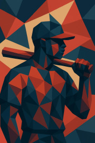 AI Prompt: **Black baseball player with flat brim baseball hat a baseball bat rests on his shoulders, made of geographic shapes, lots of triangles, colors navy blue and red, ambiguous figure ground.