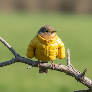 AI Prompt: a bird wearing an inflatable yellow down jacket perched on the top of a dry tree branch. the background is a blurred green grassland, in the style of real photography with natural lighting.