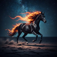AI Prompt: Close up of a thoroughbred black horse who have flames instead of mane. The flame is extremely long. The horse is running in a black desert with night sky and Blue stars in the background. Luxurious high fashion photo shoot. Professional light. Editorial photo.