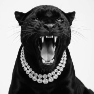 AI Prompt: close-up portrait of a black panther roaring, mouth open showing sharp teeth and tongue, wearing a luxurious diamond necklace, photographed in high contrast black and white, dramatic studio lighting, smooth fur texture, elegant and powerful fashion editorial aesthetic, crisp fine detail, minimal white background.