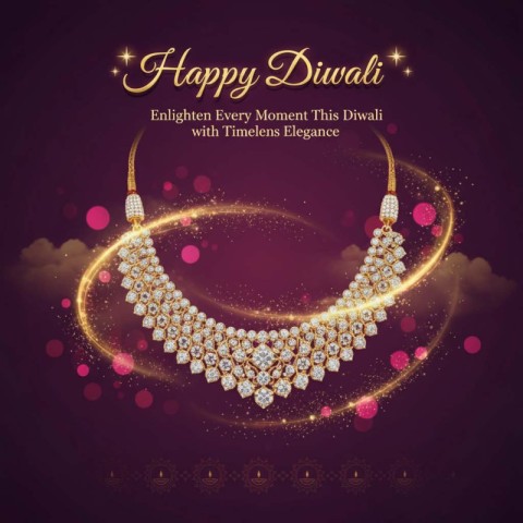 AI Prompt: Create a high-resolution 4:5 vertical festive advertisement poster for a luxury Jewelry brand celebrating Diwali. Scene: A pair of glowing gold earrings or an elegant necklace sparkling like diyas, surrounded by golden spark trails, soft shimmer dust, and delicate festive bokeh. Add subtle rangoli or diya patterns at the bottom for Diwali vibes. Background: Deep royal purple or maroon gradient with warm golden lighting. Typography:Main Text: "✨ Happy Diwali ✨" in a rich serif or elegant calligraphy font, embossed golden effect with gentle glow. Subtext: "Enlighten Every Moment This Diwali with Timeless Elegance." Style: Luxury, cinematic, ultra-realistic, premium product highlight. Lighting: Soft golden reflections, shimmer trails, and festive sparkle around jewellery. Color Palette: Gold, magenta, maroon, and deep plum tones for rich contrast.