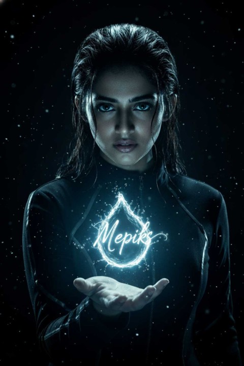 Create an image of me [photo attached] — an ultra-realistic cinematic movie poster in a 1:1 format. Background: deep black with heavy, dramatic shadows and lightly scattered water particles across the image. In the palm of the left hand, she holds a floating water sign with the word [mepiks] written in a bright, artistic cursive style — glowing intensely as