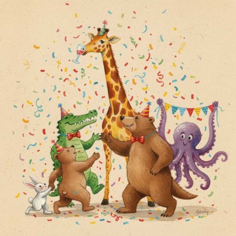 AI Prompt: Oil painting watercolor on paper, colorful forest animals jiraffe cocodrile bear rabbit and octupus celebrating in a party with confeti, beige background.