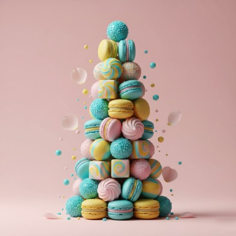 AI Prompt: Ultra-realistic luxury surreal candy tower. Create an elegant sculptural arrangement of gourmet candies, truffles, bonbons, macarons, and soft marshmallow shapes all in ONLY three colors: turquoise, yellow, and light pink. No white, no cream, no pastel mix, no additional shades. Candies must be glossy, detailed, high-end, with perfect textures: smooth glazes, sugar crystals, soft pastel swirls but strictly in the three allowed colors. Background: smooth turquoise or light pink (choose one). Add a few floating light-pink petals or tiny sugar pieces in turquoise or yellow for a dreamy surreal effect. Cinematic soft light, premium shadows, clean minimal composition. STRICT COLOR RULE: ONLY turquoise, yellow, light pink. NO white, NO beige, NO mint, NO extra tones. Ultra-realistic