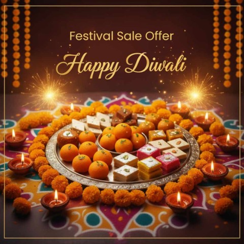 AI Prompt: Create a 4:5 vertical Instagram Diwali poster for a sweets or mithai brand. Scene: A tray of assorted festive sweets (motichoor laddoo, kaju katli, barfi) beautifully arranged with diyas, marigold flowers, and colorful rangoli background. Effects: Add glowing fairy lights and sparkler effects for Diwali charm. Typography: Main Text: "Happy Diwali" in stylish festive golden script. Subtext: "Sweeten Every Spark of Celebration!" Layout: Product centered. Logo on top. Offer banner at bottom: "Festive Hampers Available Now". Color Palette: Deep saffron, gold, and maroon. Style: Warm, festive, appetizing, premium photography look.
