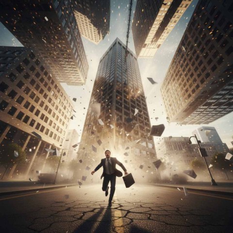 AI Prompt: The camera starts on a tight dolly shot at street level, following a businessman running as gravity begins to shift. Papers swirl, and cracks form across the pavement. It tilts upward as floors of a nearby tower break off and begin to rise in chunks. The camera lifts with the levitating debris using a crane path, then spins upside down as a full city block inverts in the air. Dust and light particles fill the air, refracted by sunlight slicing through voids in shattered buildings.