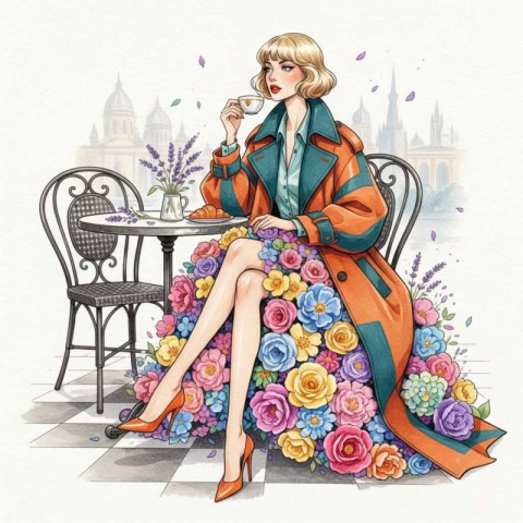 AI Prompt: Fashion illustration, Sketch of a beautiful woman having coffee in the cafe in Rome whimsical coat, blond hair with bangs and red lipstick, her skirt is made out of real fresh colourful 3d flowers, the skirt and top and shoes should only be shades of orange and teal, she's in French cafe, lavender, fashion illustration white textured paper background.