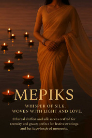 AI Prompt: Ambiance: Peaceful, romantic, culturally rich with diyas floating on water. Props: Saree drape in gentle motion, bangles sparkling softly. Include MEPIKS logo subtly reflected in water. Tagline: “MEPIKS — Whisper of Silk. Woven with Light and Love.” Product Description: Ethereal chiffon and silk sarees crafted for serenity and grace; perfect for festive evenings and heritage-inspired moments.