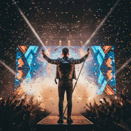 AI Prompt: Create a vertical image for Spotify featuring a singer in a jacket, radiating positive energy on stage. The image should show the singer from behind, facing the audience, clearly displaying their silhouette. Give me options for varying the artist's build, but always slim but not too thin, and with short hair. Have them use a microphone stand; make the image realistic. The artist should be Latin American.