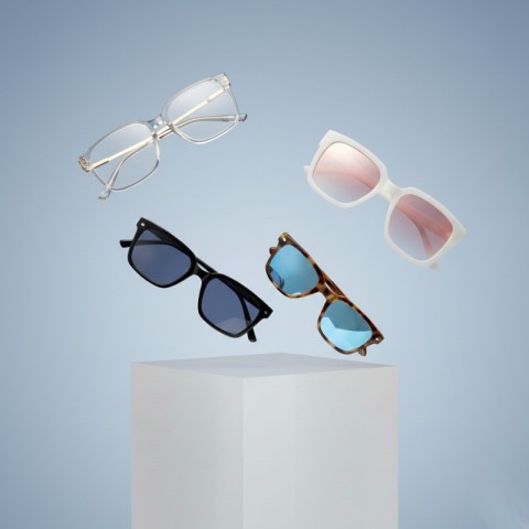 AI Prompt: Product photography: Glasses with square frames color & sunglass, floating in the air on top of a white acrylic box, against a dark blue background. Minimalist style. High resolution. diferent modelos no los mismos.