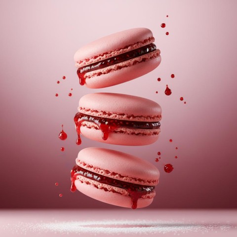 AI Prompt: A high-end food photography scene. Three colorful French macarons (rose pink), stacked vertically in mid-air, perfectly aligned, as if floating. Each macaron reveals thick, glossy raspberry jam filling oozing slightly from the sides. Tiny splashes of raspberry sauce float in the air for dynamic effect. Background is a smooth gradient of soft pastel pink to burgundy, with cinematic lighting emphasizing glossy jam and delicate macaron shells. At the base, powdered sugar dust is spread elegantly. Ultra realistic textures, premium food advertising, 8K detail.