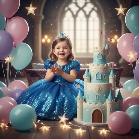 AI Prompt: Create an ultra-realistic, 8K cinematic portrait of a 3-year-old girl (keep the face exactly same). She is wearing a royal blue princess gown with glitter details and a matching tiara. She is sitting on a decorated chair beside a big birthday cake shaped like a castle. The background is filled with pastel balloons, star-shaped fairy lights, and dreamy soft blur. Her expression is joyful, clapping hands while looking at the cake. DSLR sharpness, cinematic lighting. make sure the face remains Same and 100 percent reserved
