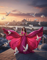 AI Prompt: Create a stunning edit of me in Turkey, And 4K HD Istanbul, standing on a rooftop. I am wearing a long, flowing hot pink flying dress that spreads beautifully in the wind. Around me, white pigeons are flying, adding a dreamy and cinematic atmosphere. The background should show Istanbul's skyline with a magical vibe.
