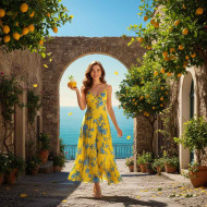 AI Prompt: Here's a full-body image of a girl with a bright appearance walking through the streets of Amalfi, complete with lemon trees, the sea, and ice cream in half a lemon: