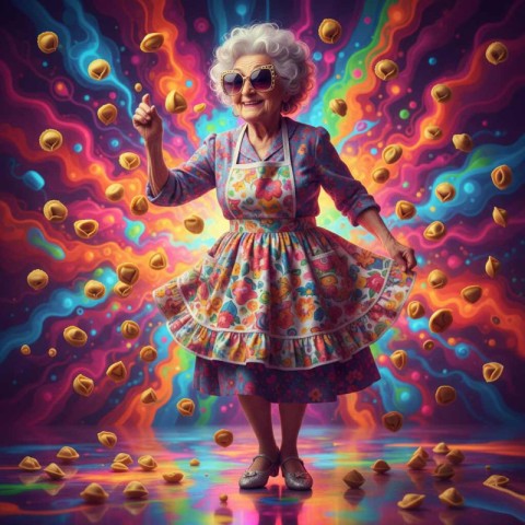AI Prompt: Realistic photo of italian grandmother in sunglasses dancing on psychedelic background with flying small tortelininis.