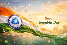 AI Prompt: A vibrant and patriotic Happy Republic Day Celebrations creative banner design featuring the Indian tricolor flowing dynamically across the scene. The Ashoka Chakra is prominently displayed with a glowing, elegant effect. Iconic Indian landmarks such as India Gate and Rashtrapati Bhavan appear subtly in the background, bathed in warm morning light. The atmosphere feels celebratory and proud, with flying doves, soft light flares, and confetti in saffron, white, and green. Clean, modern typography space is left for the text ‘Happy Republic Day’. Professional graphic design style, high resolution, social media banner format, festive yet elegant, inspirational mood.”