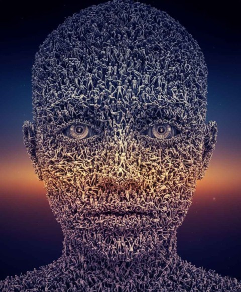 AI Prompt: Thousands of humans in different poses, shapes and sizes together form a human face, inspired by fractals. the human shapes bend and stretch to function as the different shapes in the face.