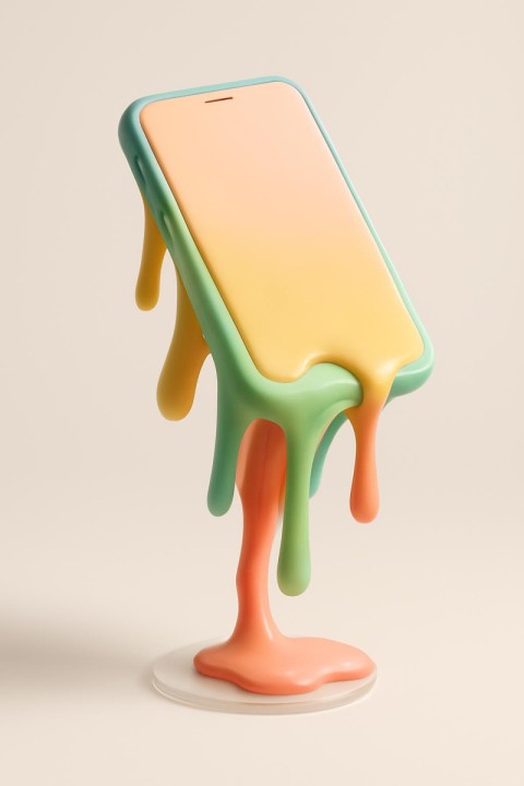 AI Prompt: Create a hyper realistic [X:Y] poster of an [iPhone] suspended mid-air, seamlessly melting and deforming from intense heat as if made of thick, viscous wax, with the surreal effect applying uniformly to all its parts regardless of their original material. Each distinct component is a single, bold yet soft pastel color, melting in a smooth, matte, and aesthetically pleasing manner. The shot is a dynamic low-angle view emphasizing the distortion, illuminated by soft, diffused lighting against a clean, bright background, rendered in a vibrant pastel color palette to achieve a stylish, hyperrealistic 3D model appearance.
