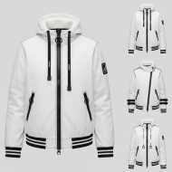 AI Prompt: Accurate design variations of this lightweight jacket in strong white color. Keep the same silhouette, fit, collar shape, and overall construction and black and white stripe hem rib. Change only the zipper style, pocket zippers, trim details, stitching, and finishing elements to make the jacket look more modern and cool, contrast to the trims. clean product photography, neutral background, technical garment rendering, fashion design accuracy.