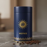 AI Prompt: A photorealistic 3D mockup of primary packaging for a luxury coffee brand named 'Mepiks'. The packaging is a tall, elegant cylindrical tin made of matte deep navy blue metal. It features an embossed gold foil logo with an intricate sunburst and coffee bean motif. Around the bottom, there is a laser-etched gold filigree pattern. The tin sits on a dark marble surface with a few roasted coffee beans scattered around. Soft, cinematic lighting highlighting the metallic gold textures. 4k resolution, professional product photography.