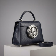 AI Prompt: : A high-end, structured women's medium-sized top-handle bag named "The Vault Bag". Bold angular geometric design, made from luxurious deep navy blue (dark kahli) Saffiano/Epi-style grained calf leather. Focus on a central lock inspired by a miniature vault safe door mechanism, crafted from heavy brushed-steel (matte polished stainless steel). Immaculate saddle stitching, structural base feet, detachable crossbody strap. Ultra-photorealistic high-fashion studio shot with soft side lighting, crisp highlights on the leather grain and metal lock, premium product photography, extremely detailed, 8K resolution.