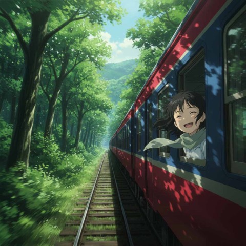 AI Prompt: A scene from a high-quality animated film, like a work by Makoto Shinkai. In a deep midsummer forest, a train speeds down tracks showered in sunlight filtering through the trees (komorebi). The camera weaves through the trees, chasing the train to emphasize the sense of speed. A girl with her head out the window is bathed in the rapidly changing light and shadow, her hair fluttering in a wind that carries the scent of green. The trees in the background become a green afterimage, vividly highlighting her expression, full of liberation, from moment to moment.