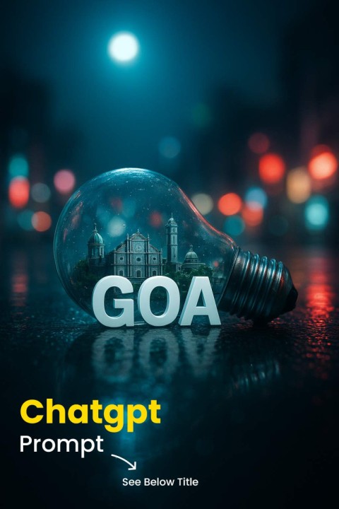 Create a hyper-realistic, stylish poster featuring a light bulb lying on wet urban asphalt. Inside the bulb, place a miniature version of [Goa] with its iconic landmarks. A sleek white 3d text of the city name [Goa] should stand prominently in front of the bulb. The background is a softly blurred cityscape with neon lights reflecting on the bulb's glass and the wet pavement. Add volumetric moonlight for depth and atmosphere. The image should look like a high-quality DSLR photograph with sharp details, cinematic lighting, and a moody, futuristic vibe.