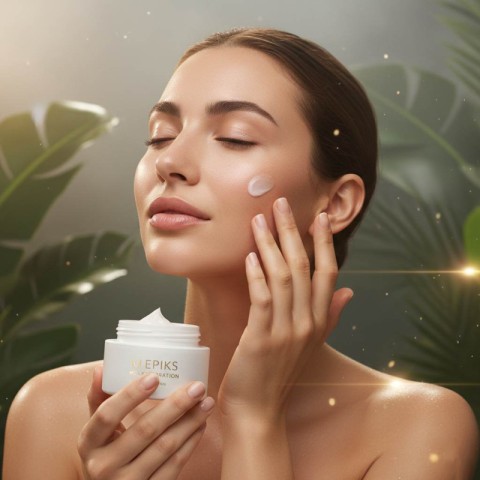 AI Prompt: Create an image of Mepiks holy hydration cream for a 9x16 image that includes their cream and a Model applying the product to her face.