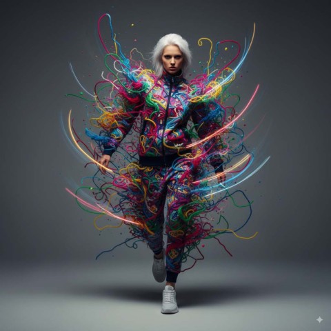 AI Prompt: Avant-garde fashion photography, a model with platinum blonde hair strides forward, their designer tracksuit dissolves into an explosion of colorful, tangled yarn and light streaks, surreal motion, on a seamless grey backdrop.