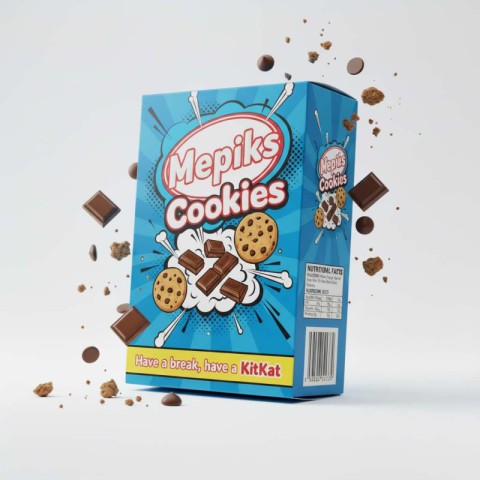 AI Prompt: modern product packaging mockup of a red cookie box labeled "Mepiks Cookies" colorful pop art style appetizing and vibrant lighting the box is 3/4 facing, highly detailed with barcode, ingredients list, nutritional facts, and brand slogan "Have a break, have a Mepiks" on a bright, clean background with crumbs and chocolate pieces flying around hyperrealistic lighting like a commercial ad sharp focus, realistic shadows.