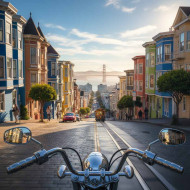 AI Prompt: Photo realistic 8k HD of First person view on a motor cycle driving uphill in San Francisco colorful city.
