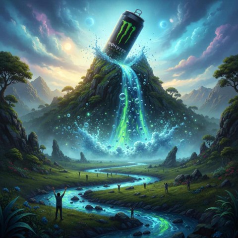 AI Prompt: Create a surreal, ultra-photorealistic landscape that blends nature and fantasy, centered around a gigantic, tilted "Brand Name" can perched dramatically atop a lush green mountain peak. The can appears open, pouring out a massive, vibrant waterfall of energy -infused water that crashes down the rocky cliffs with intense splashes, swirling bubbles, glowing highlights, and mist filled with shimmering particles. The waterfall forms a wide, winding river that snakes through a serene, untouched valley, with tiny human figures scattered along the riverbanks, gazing in awe-emphasizing the grand scale and wonder of the scene. The sky above is bright and expansive, dotted with soft.